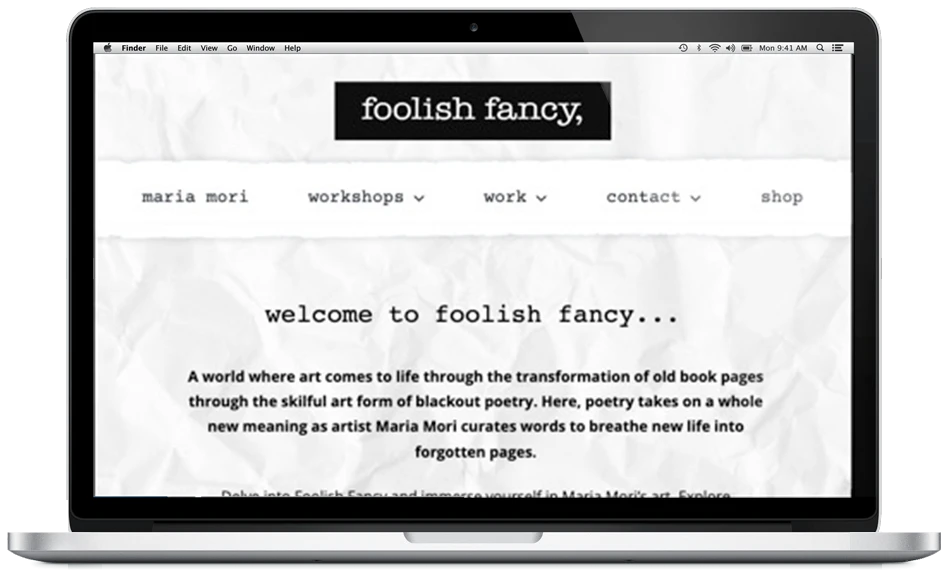 The Foolish Fancy website serves as a refined, artistic space dedicated to the work of Maria Mori — a blackout poetry artist based in Karratha, WA. It showcases her unique approach of transforming forgotten book pages into visual poetry through erasure, illustration, and mixed media. The site beautifully blends creative identity, artistic philosophy, and accessible profile detail, inviting visitors into her imaginative world.